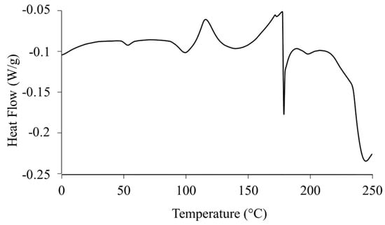 The DSC thermograms of raw RocBr (Figure 4) exhibited broad endothermic peaks at 53.6 °C, 96.9 °C and 173.2 °C, representing a glass transition (Tg) step followed by water loss and melting decomposition, respectively. The enthalpy and temperature values are summarized in Table 1. The predicted melting point of RocBr is ~169 °C.