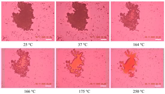 Raw RocBr showed irregularly shaped aggregated particles without birefringence, indicating the non-crystalline nature of the solid-state drug, which was consistent with its XRPD diffractogram (Figure 5). At 164–166 °C, raw RocBr solid-state particles started to show a solid-to-liquid phase first-order transition, characteristic of melting, at ~175 °C. As temperature increased, RocBr remained in a liquid state, with possible decomposition shown at 250 °C. The transitions observed during HSM were consistent with DSC thermograms (Figure 4).