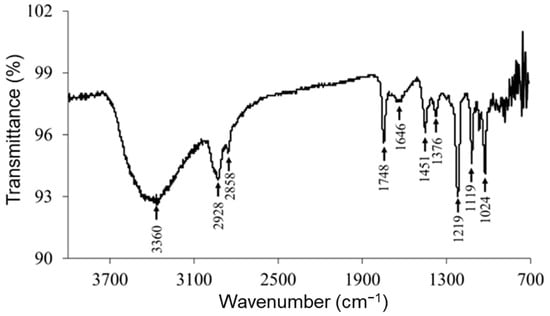 Figure 7 shows the ATR–FTIR spectrum of RocBr. The FTIR spectrum showed characteristic peaks (cm−1) at 3360 (ν O–H, phenolic), 2928, 2858 (ν C–H, alkane), 1748 (ν C=O, ester), 1646 (ν C=C, alkene), 1451 (δ O–H, phenolic), 1376, 1219 (ν C–N), 1119 and 1024 (ν C–O, ester), as previously reported [14,15]. The spectral pattern seen in the fingerprint region (<1000 cm−1) was consistently observed in raw RocBr.
