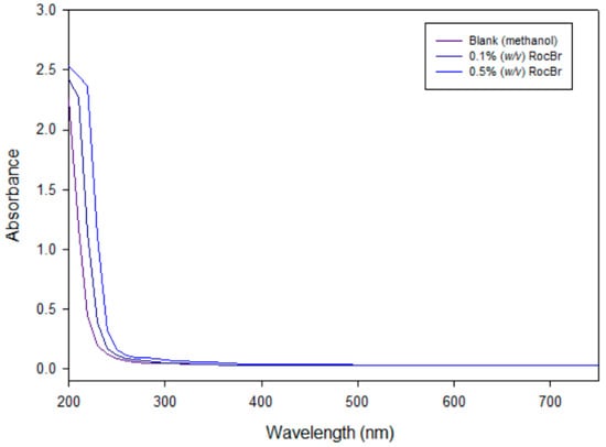 An absorption below wavelength of 200–250 nm (UVA) with a lambda maximum was observed in the UVA region at 210 nm, in both 0.1% (w/v) and 0.5% (w/v) RocBr solutions, when compared to methanol as a blank (Figure 8).