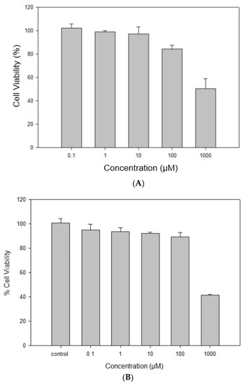 HaCaT and NHEK cells were seeded into 96-black well plates at 5000 cells in 100 µL medium per well. After 48 h, cells were exposed to RocBr at concentrations of 1000 µM, 100 µM, 10 µM, 1 µM or 0.1 µM. Drug solutions were prepared by dissolving raw RocBr powder in 1 mL of HPLC-grade ethanol (EtOH) and diluted with 9 mL of growth media. A volume of 100 µL of drug solution was added to each well. After 48 h, 20 µL of 20 µM resazurin sodium salt was added to each well and incubated for 4 h. Fluorescence intensity of resofurin was detected at 544 nm (excitation) and 590 nm (emission) using the Molecular Devices® SpectraMax® M3 Multi-Mode Microplate Reader (Sunnyvale, CA, USA). The relative viability of the cells was calculated by Equation (2) as follows: