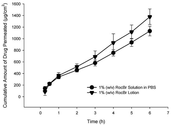 In vitro EpiDermTM permeation profile of RocBr. 1% (w/v) PBS (pH = 7.4) solution and 1% (w/v) RocBr lotion.