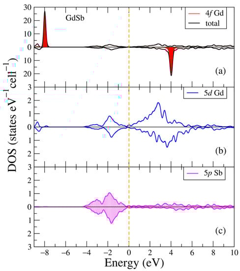 One can note the contributions of Gd-5d and Sb-5p states in the valence band of the GdSb compound, as seen in Figure 1b,c. For both spin projections, the Gd-5d electronic states are located in the conduction band, and are mostly not occupied (Figure 1b). In [], it was discussed that these energy positions of the electronic states allow one to reproduce and interpret the semimetallic behavior of the experimental optical conductivity curve for GdSb. The other electronic states (not shown in Figure 1) have negligible contributions.