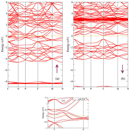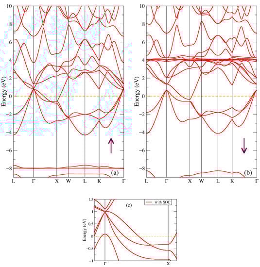 In Figure 2, one can see the band structure of both spin projections of the binary GdSb compound. It is obvious in the figure that this phase is gapless with the valence and conduction bands nearly touching. Bands near the Г point from the valence band spread above the Fermi level creating a hole pocket, same with bands from the conduction band, which create an electron pocket near the X point; such features are typical for semimetals []. There are noticeable flat bands at energies −8.0 eV for one spin direction, see Figure 2a, and 4 eV for other spin direction, see Figure 2b, which correspond to the Gd-4f intense peaks with the same energies plotted in red in Figure 1a. One can also notice few points with degenerate bands near the Fermi energy, moving from the Г high-symmetry point to X for the majority spin projection, as it is clearly seen in Figure 2a. The similar semimetallic band structure was obtained using HSE06 hybrid functional without spin-orbit coupling []. The Figure 2c panel shows a small part of the band structure near the Fermi level with spin-orbit coupling (SOC). The degeneration at point X is lifted, and one of the bands at point Г shifted a few tenths of eV lower. In the HSE06 hybrid, functional with SOC [], the changes of the bands are very similar; there the difference in the degeneracy of the bands at the Г point and the electronic pocket at X are closer to the Fermi energy. The very recent ARPES measurements for a 20 nm thick GdSb magnetic semimetal film [] revealed an ellipsoidal electron pocket at the bulk X point, two nearly spherical light-hole spin-orbit split-off bands at the bulk Г point, and a warped heavy-hole band resembling a square Fermi surface. The authors of [] used the DFT+U band structure, which is very similar to the one depicted in Figure 2c, to interpret the ARPES bands; however, the band dispersion in Figure 2c with SOC can better reproduce the β and δ bands (Figure 3 and Figure 4 in []) with the valence and conduction bands almost touching near point X.