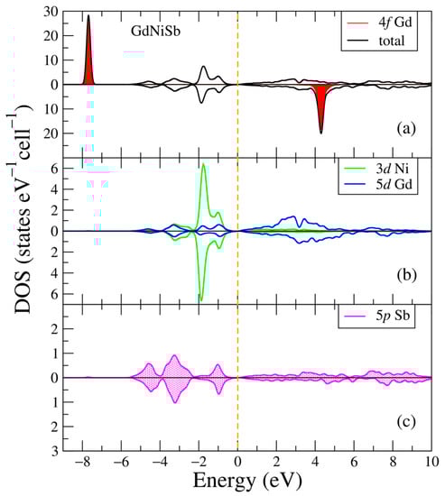 In Figure 3, the electronic structure of the GdNiSb intermetallic compound is plotted for two opposite spin directions. Similar to Figure 1a, one can see two intense peaks from the 4f Gd states being a little bit higher than in the binary GdSb compound energies: −7.7 eV and 4.3 eV. Two other noticeable intense peaks lay at −1.9 eV for both spin projections, and belong to the electronic states of the occupied 3d Ni shell, similar to the position of this peak in the calculations []. The valence band here mostly comprises the 3d Ni states with the smaller contributions from the 5d Gd and 5p Sb states, and the main contributors to the conduction band are the 5d Gd states, see Figure 3b,c. All shown electronic states except 4f Gd are non-polarized. The other electronic states (not shown in Figure 3) have negligible contributions. This picture of the electronic states is different from local spin-density approximation (LSDA) [] because the corrections for strong electron correlations and SOC are required for the 4f shell and bands near the Fermi energy. The calculations resulted in the magnetic moment being 7.20 in GdNiSb, the magnetization measured being 8.1(5) [], and previous theoretical calculations being 7.00 [,] and 6.949 [].