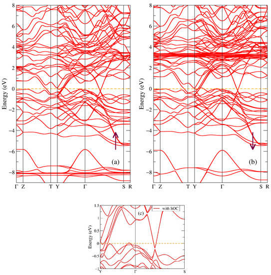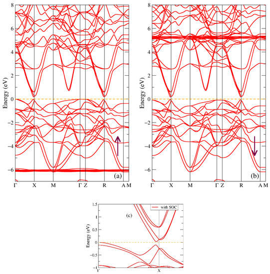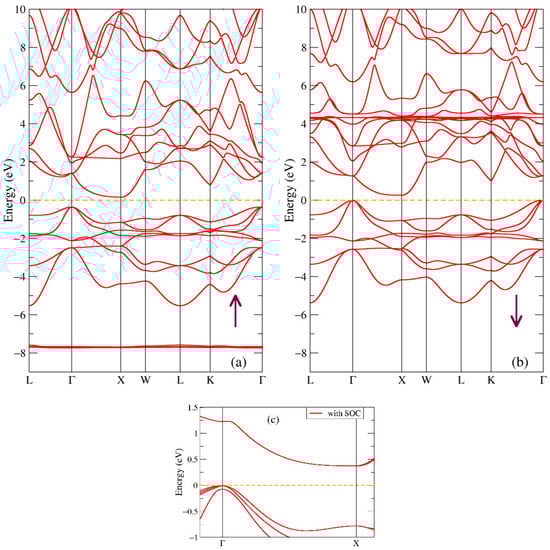 Band structure of GdSbS2O: (a) majority (up arrow) and (b) minority (down arrow) spin projections. Panel (c) shows the effect of spin-orbit coupling.