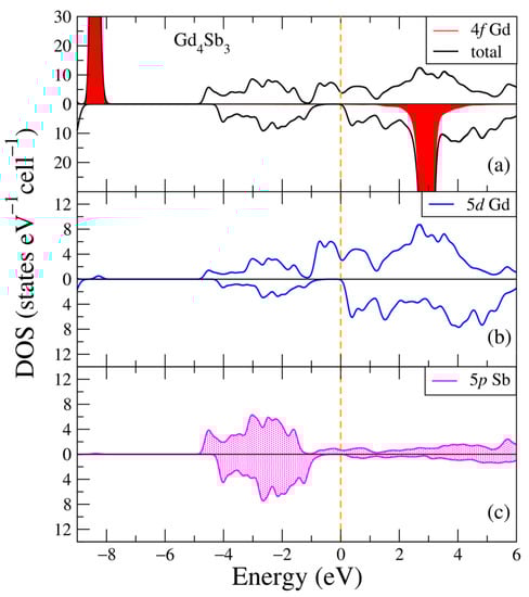 In Figure 5, the electronic structure of the Gd4Sb3 intermetallic compound is plotted for two opposite spin directions. Similar to Figure 1a and Figure 3a, one can see two intense peaks from the 4f Gd states at the following energies: −8.4 eV and 3.0 eV. The valence band is composed of the 5p Sb states and less amount of the 5d Gd states, and the main contributors to the conduction band are the 5d Gd states, see Figure 5b,c. One can notice that the density of states is quite high around the Fermi energy for the majority spin projection, Figure 5a,b which suggests the metallic nature of the compound, but in the minority spin projection, there is an obvious energy gap. Such a band structure is typical of half-metals, and it is a key feature of this Gd-bearing compound. The other electronic states (not shown in Figure 5) have negligible contributions.