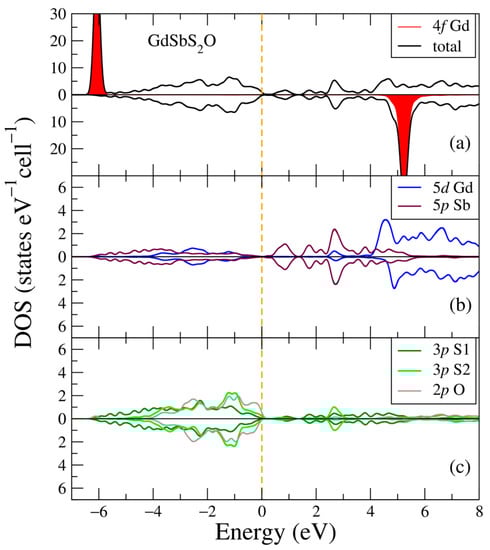 In Figure 7, the electronic structure of the GdSbS2O compound is plotted for two opposite spin directions. Similar to Figure 1a, Figure 3a and Figure 5a, one can see two intense peaks from the 4f Gd states at energies −6.1 and 5.2 eV, which are higher than in previous compounds. The main contributors to the valence band here are the 3p S1, S2, and 2p O electronic states added to the structure with S and O atoms. The conduction band is now mostly made of the 5p Sb electronic states, which built the valence band in the three previous compounds, and the 5d Gd electronic states moved to higher energies. The other electronic states (not shown in Figure 7) have negligible contributions. One can notice what looks like the absence of electronic states between valence and conduction bands, which suggests that there might be a small gap in the band structure.