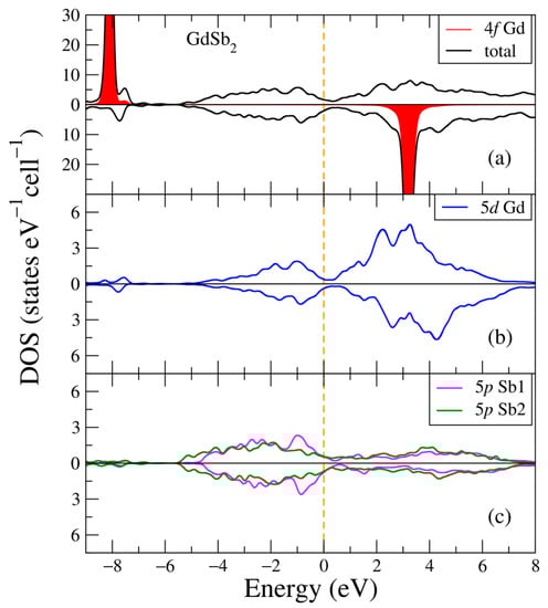 In Figure 9, the electronic structure of the GdSb2 intermetallic compound is plotted for the two opposite spin directions. Similar to the previous electronic structures, one can see two intense peaks from the 4f Gd states at the following energies: −8.1 eV and 3.2 eV. The valence band is composed of the hybridized 5p Sb1, Sb2, and 5d Gd electronic states, and the main contributors to the conduction band are the 5d Gd electronic states, see Figure 9b,c. One can notice that there is non-zero density of states around the Fermi energy with the valence and conduction bands overlapping for both spin projections Figure 9a suggests the metallic nature of the compound. The other electronic states (not shown in Figure 9) have negligible contributions.