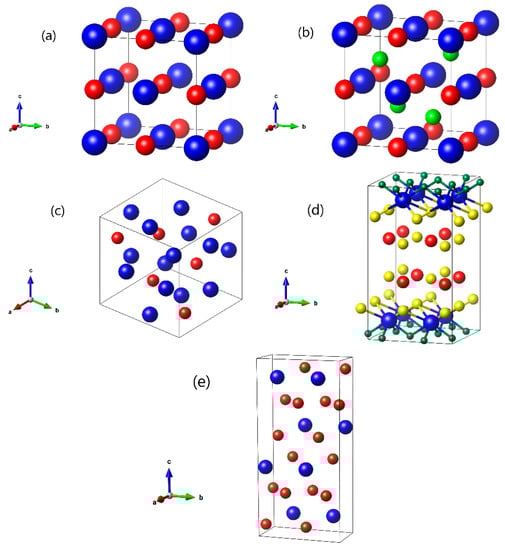 Crystal structure of: (a) GdSb; (b) GdNiSb; (c) Gd4Sb3; (d) GdSbS2O; (e) GdSb2 compounds plotted in Vesta []. Gd atoms are shown in blue, Ni in green, Sb in red, S in yellow, and O in dark green.