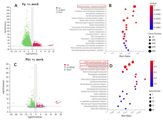 Concretely, when comparing the Fp vs. mock group, it was found that the number of down-regulated DEGs (17,828) was higher than the number of up-regulated DEGs (13,527) (Figure 5A). Among them, the DEGs were mainly enriched in photosynthesis antenna protein pathway according to the Kyoto Encyclopedia of Genes and Genomes (KEGG) pathway analysis (Figure 5B). Similarly, in the Piri vs. Mock group, the number of down-regulated DEGs (507) was higher than the number of up-regulated DEGs (134) (Figure 5C). The difference was that the number of DEGs decreased significantly and were mainly enriched in MAPK signaling pathway, plant–pathogen interaction, and phenylpropanoid biosynthesis (Figure 5D). A similar situation also occurred in the Piri + Fp vs. Mock comparison group, where the number of down-regulated genes (17,425) was higher than that of the up-regulated genes (10,091) (Figure 5E). KEGG analysis suggested that the DEGs were mainly enriched in the phenylpropanoid biosynthesis and the MAPK signaling pathway (Figure 5F). In the Piri + Fp vs. Fp group, however, the number of up-regulated genes (10,836) was higher than the number of down-regulated genes (9921) (Figure 5G), and these DEGs were mainly enriched in phenylpropanoid biosynthesis (Figure 5H). Additionally, it was evident that many DEGs were enriched in the phenylpropanoid biosynthesis pathway in the Piri vs. Mock, Piri + Fp vs. Mock, and Piri + Fp vs. Fp comparison groups.
