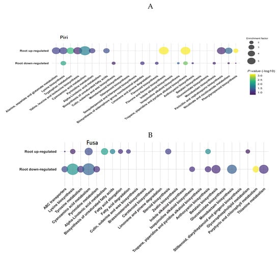 To explore the disease resistance to F. pseudograminearum in wheat under colonization by P. indica, non-targeted metabolic analysis was performed on wheat roots. Different metabolic profiles were identified in wheat roots under different treatments (Figure 9A–C). Primary metabolic processes, including amino acid and lipid metabolism, were up-regulated under P. indica colonization when compared with the control plants. It is well known that plant growth and development are affected by the primary metabolic processes involved in the synthesis of proteins, carbohydrates, and lipid-related substances [13]. This is the reason why the colonization of P. indica can promote plant growth. Especially, the flavone and flavonol biosynthesis; phenylpropanoid biosynthesis; and tropane, piperidine, and pyridine alkaloid biosynthesis were significantly upregulated upon P. indica colonization (Figure 9A). In the treatment of F. pseudograminearum infection, more metabolites involved in lysine biosynthesis, cyanoamino acid, monobactam biosynthesis, and glycerophospholipid metabolism were found to be down-regulated (Figure 9B). Whereas, in the Piri + Fp treatment, the metabolites involved in flavonoids biosynthesis, indole alkaloid biosynthesis, and phenylpropanoid biosynthesis were upregulated (Figure 9C). Evidently, metabolome data showed that metabolite accumulations belonging to the phenylpropanoid metabolic pathway were induced in wheat resistance to F. pseudograminearum mediated by P. indica, which also confirmed the transcriptome results. Metabolome data further showed that the number of up-regulated metabolites in roots was lower than that of down-regulated metabolites after F. pseudograminearum treatment, while the number of up-regulated metabolites was greater than that of the down-regulated metabolites in both the Piri treatment group and the Piri + Fp group. This also suggests that metabolome expression profile could be modified upon P. indica colonization.