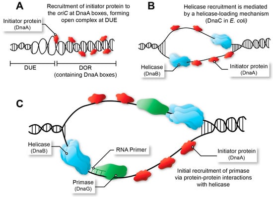 Initiation of DNA replication and the formation of the primosome at the origin (oriC in E. coli). (A) The initiator protein (DnaA) instigates chromosome replication through its binding to specific motifs within the DnaA-oligomerisation region (DOR), melting the DNA at the DNA unwinding element (DUE) to form the open complex. (B) Two hexameric helicases (DnaB6) as well as SSB tetramers (not depicted) are recruited to expand the replication bubble. (C) Final stage of initiation involving recruitment of the primase (DnaG) and initial RNA primer synthesis for the leading strand.
