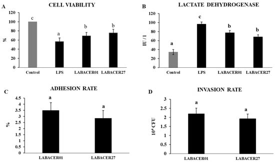 Cell viability (A), lactate dehydrogenase (LDH) release (B), adhesion rate (C), and invasion rate (D) in human colorectal epithelial Caco-2 cells challenged with KPC-2-producing hypermucoviscous ST25 strains of Klebsiella pneumoniae. Caco-2 cells were challenged with K. pneumoniae LABACER01, K. pneumoniae LABACER27, or LPS for 24 h. Untreated cells were used as controls. Results represent data from three independent experiments. Letters indicate significant differences between the groups, a < b < c, p < 0.05.