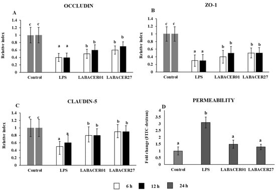 Relative expression of tight junction protein (A) occludin, (B) ZO-1, and (C) claudin-5 in human colorectal epithelial Caco-2 cells challenged with KPC-2-producing hypermucoviscous ST25 strains of Klebsiella pneumoniae. Caco-2 cells were challenged with K. pneumoniae LABACER01, K. pneumoniae LABACER27, or LPS for 6 or 12 h. Untreated cells were used as controls. (D) Caco-2 cell large solute permeability by using the FITC-dextran flux method after the stimulation of cells with K. pneumoniae LABACER01, K. pneumoniae LABACER27, or LPS for 24 h. Results represent data from three independent experiments. Letters indicate significant differences between the groups, a < b < c, p < 0.05.