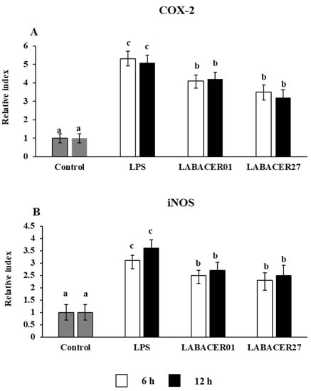 The expressions of the inducible nitric oxide synthase (iNOS) and cyclooxygenase 2 (COX-2) are upregulated by the intestinal epithelium after inflammatory challenges. Then, we evaluated the relative expression of iNOS and COX-2 in Caco-2 cells stimulated with LPS, LABACER01, and LABACER27. As shown in Figure 3, there was a significant upregulation in the relative gene expression of both COX-2 and iNOS in Caco-2 cells stimulated with LPS or challenged with the K. pneumoniae ST25 strains at 6 h and 12 h compared to unchallenged control cells. The expression levels for COX-2 and iNOS were similar for LABACER01 and LABACER27 strains, and both groups have lower levels of these genes compared to cells stimulated with LPS (Figure 3).