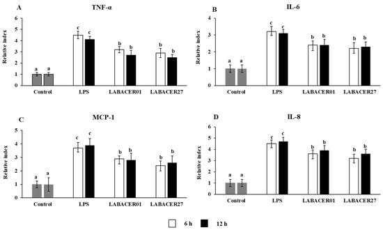 Relative gene expression of TNF-α (A), IL-6 (B), MCP-1 (C), and IL-8 (D) in human colorectal epithelial Caco-2 cells challenged with KPC-2-producing hypermucoviscous ST25 strains of Klebsiella pneumoniae. Caco-2 cells were challenged with K. pneumoniae LABACER01, K. pneumoniae LABACER27, or LPS for 6 or 12 h. Untreated cells were used as controls. Results represent data from three independent experiments. Letters indicate significant differences between the groups, a < b < c, p < 0.05.