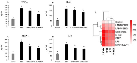 Concentration of TNF-α (A), IL-6 (B), MCP-1 (C), and IL-8 (D) in the supernatant of human colorectal epithelial Caco-2 cells challenged with KPC-2-producing hypermucoviscous ST25 strains of Klebsiella pneumoniae for 24 h. Caco-2 cells were challenged with K. pneumoniae LABACER01, K. pneumoniae LABACER27, or LPS. Untreated cells were used as controls. Results represent data from three independent experiments. Letters indicate significant differences between the groups, a < b < c, p < 0.05. (E) Heat map showing the concentration (pg/mL) of TNF-α, IL-6, MCP-1, and IL-8 in the supernatant of human colorectal epithelial Caco-2 cells challenged with KPC-2-producing hypermucoviscous ST25 strains of K. pneumoniae compared with Caco-2 cells challenged with Salmonella Typhimurium TUCO-I7 (Salmonella), enterohemorrhagic E. coli TUCO-I6 (EHEC), enterotoxigenic E. coli TUCO-I5 (ETEC), and K. pneumoniae NTUH-K2044 were used for comparisons. Cytokines were measured after 24 h of stimulation.