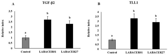 Relative gene expression of TGF-β2 (A) and TLL1 (B) in human colorectal epithelial Caco-2 cells challenged with KPC-2-producing hypermucoviscous ST25 strains of Klebsiella pneumoniae. Caco-2 cells were challenged with K. pneumoniae LABACER01, or K. pneumoniae LABACER27 for 12 h. Untreated cells were used as controls. Results represent data from three independent experiments. Letters indicate significant differences between the groups, a < b, p < 0.05.