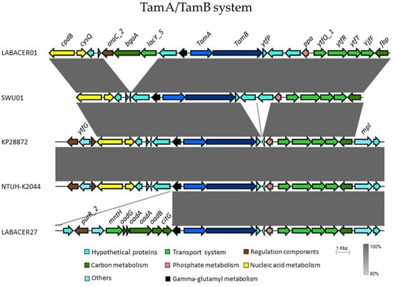 The synteny of the TamA/TamB system genes was found to be conserved in the analyzed strains, this system being found upstream of transport systems genes (ytfQ_1, ytfR, ytfT, and ytfF) and of fructose-bisphosphatase (fbp), and downstream of the genes cpdB and cysQ (Figure 7).