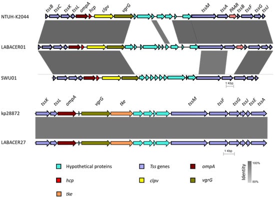 In addition, at least one cluster for T6SS was identified in each strain. K. pneumoniae KP28872 and LABACER27 presented a similar cluster, composed of the genes: tssA, tssE, tssF, tssG, tssI (vgrG), tssJ, tssk, tssL, and tssM (Table 1, Figure 8). On the other hand, the LABACER01, NTUH-K2044, and SWU01 strains presented a cluster that differed from the previous one due to the presence of the tssB, tssC, tssD (hcp), and PAAR genes, and the absence of tssE (Table 1, Figure 8).