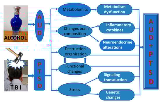 AUD can cause neurochemical and behavioral changes in the brain. TBI disrupts the normal physiological state of the brain, resulting in changes in brain structure and metabolism, so patients with PTSD following TBI may have a series of alterations in brain molecular components. Despite significant advancements in understanding the molecular complexity of AUD and the dynamics of the action mechanism of alcohol misuse [50,51,52], identifications of objective state markers that can be universally recognized are needed for AUD [53]. The objective identification of state markers and effective treatment for PTSD is more challenging [54,55]. The brains of patients with AUD/PTSD show complex signs of mixed changes in the molecular components of the two diseases. Table 2 summarizes some of the molecular and biochemical changes, including metabolism/pharmacokinetics, inflammatory factors, and neuroendocrine alterations, that occur in the brain as a result of PTSD, AUD, and AUD/PTSD.
