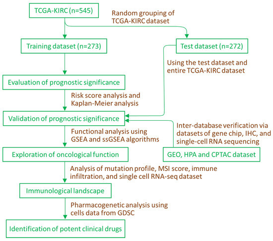 Workflow chart illustrating a supervised learning principle in conjunction with multi-omics analysis, inter-database verification and pharmacogenetic analysis. CPTAC, Clinical Proteomic Tumor Analysis Consortium. GDSC, Genomics of Drug Sensitivity in Cancer. GEO, Gene Expression Omnibus. HPA, human protein atlas. IHC, immunohistochemistry. GSEA, gene set enrichment analysis. KIRC, kidney renal clear cell carcinoma. ssGSEA, single-sample gene set enrichment analysis. TCGA, The Cancer Genomic Atlas.