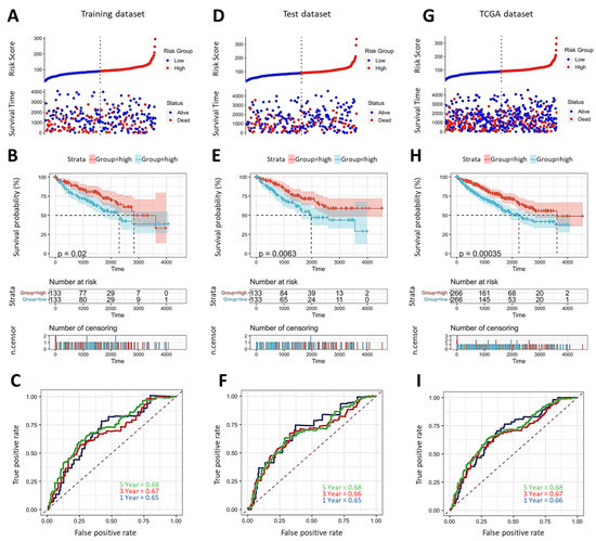 Low IMMT expression levels predict unfavorable prognoses. Risk score analysis of IMMT expressions with overall survival events in the training dataset (A), the test dataset (D) and the entire TCGA dataset (G). Overall survival probability of BC patients based on low/high IMMT grouping in the training dataset (B), the test dataset (E) and the entire TCGA dataset (H). Time-dependent ROC in the training dataset (C), the test dataset (F) and the entire TCGA dataset (I).