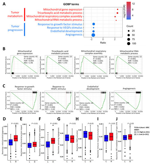 To gain more insights into the underlying molecular basis of IMMT in KIRC, we utilized RNA sequencing data from TCGA to conduct gene set enrichment analysis (GSEA). As shown in Gene Ontology Biological Process (GOBP) terms (Figure 4A), IMMT in KIRC was involved in the activation of tumor metabolism (GOBP: mitochondrial gene expression, tricarboxylic acid metabolic process, mitochondrial respiratory complex assembly and mitochondrial RNA metabolic process) (Figure 4B) and in the inhibition of tumor progression (GOBP: response to growth factors stimulus, response to VEGFs stimulus, endothelial development and angiogenesis) (Figure 4C). Furthermore, Reactome pathways unveiled by ssGSEA confirmed the impacts of low IMMT expressions on the inhibition of mitochondrial biogenesis (Figure 4D), mitochondrial protein import (Figure 4E) and mitochondrial beta oxidation (Figure 4F), and on the promotion of sprouting angiogenesis (Figure 4G) and endothelial nitric oxide synthase (ENOS) activation (Figure 4H). Interestingly, we noted that low IMMT was associated with a suppressed immune response to tumor cells (Figure 4I) and interferon regulatory factor 3 (IRF3)-mediated induction of type I interferons (Figure 4J). Collectively, low expressions of IMMT were implicated in mitochondrial inhibition and angiogenetic activation.
