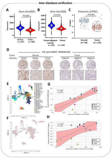Inter-database verification confirms the clinical significance of IMMT in differential expression and immunological landscapes. Panels A and B show violin plots of gene chip-based expression levels of IMMT that were sourced from GEO datasets that display normal kidney tissue vs. KIRC tumor (A) and tumor-adjacent normal tissue vs. tumor tissue in KIRC samples (B). Box plot showing proteomics data of IMMT protein expression levels of normal kidney tissue and KIRC tumors, which were sourced from CPTAC datasets (C). IHC imaging of the HPA database showing the anti-IMMT (HPA036165)-detected IMMT protein expression levels of normal kidney tissue and KIRC tumors (D). Cell type deconvolution of GSE111360 single-cell RNA sequencing data. Panels E and F show Uniform Manifold Approximation and Projection (UMAP) plots showing all cell subtypes (E) and IMMT expression mapping onto cell types (F). Linear regression plot representing the Spearman’s correlation of IMMT expression levels in CD8+ cells expressing GZMK with the abundance of CD8+ cells expressing GZMK (G). Linear regression plot representing the Spearman’s correlation of IMMT expression levels in CD4+ cells expressing CCR7/TCF7 with the abundance of CD4+ cells expressing CCR7/TCF7 (H).