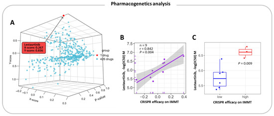 To investigate the potential of IMMT as a companion biomarker, we examined the association between CRISPR efficacy on IMMT and cellular response to 427 drugs in KIRC cell lines. We found that lestaurtinib exibited significantly altered cytotoxicity in response to CRISPR-perturbed IMMT gene expression (Figure 7A). In particular, the CRISPR efficacy on IMMT (i.e., the lower IMMT expressions) had a positive correlation with lestaurtinib toxicity in KIRC cells (Figure 7B). We then used a 50% CRISPR efficacy cutoff to divide cells into groups with low and high CRISPR efficacy on IMMT and compared lestaurtinib sensitivity. As shown in Figure 7C, cells with high CRISPR efficacy on IMMT presented greater lestaurtinib sensitivity. Overall, our pharmacogenetic prediction identifies lestaurtinib as a potent drug for KIRC in the context of low IMMT expression levels.