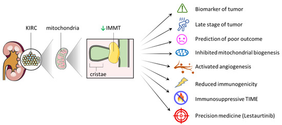 Graphic summary depicting the significance of IMMT in a variety of clinical scenarios and pathophysiological aspects of KIRC. Green arrow represents decreased IMMT expression.