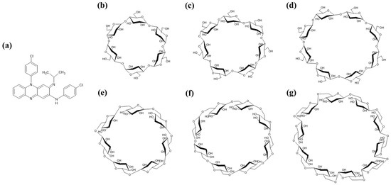 Chemical structure of CFZ, CDs, and CIs. CFZ, clofazimine; CI, cyclodextran; CD, cyclodextrin. (a) CFZ, (b) α-CD, (c) β-CD, (d) γ-CD, (e) CI-7, (f) CI-8, and (g) CI-9.