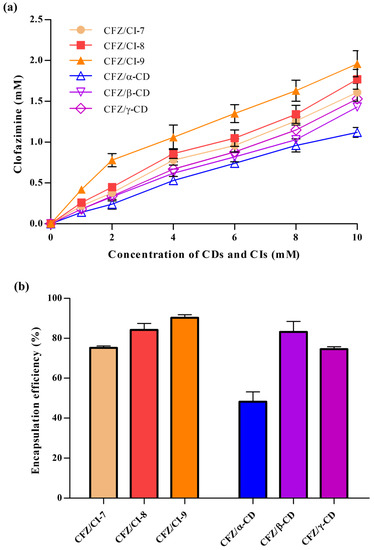 The encapsulation efficiencies (EEs) of the inclusion complexes of CFZ with CIs and CDs ranged from 50.8 ± 4.52% to 91.9 ± 1.44%, revealing significant differences (Figure 2b). The highest EE (91.9%) was obtained with the CFZ/CI-9 complex, with a CFZ:CI-9 molar ratio of 0.2:1, while the lowest EE (50.8%) was observed in the case of the CFZ/α-CD complex, with a CFZ:α-CD molar ratio of 0.01:1. The differences in EE could be attributed to various factors, including the chemical structure and physical properties of the guest molecule, the type of interaction between CFZ and the CIs or CDs, and the procedure used to synthesize the complexes. According to their EEs, the CFZ/CI and CFZ/CD complexes had the following relationship: CFZ/CI-9 > CFZ/CI-8 > CFZ/β-CD > CFZ/CI-7 > CFZ/γ-CD > CFZ/α-CD. The results suggest that there are favorable interactions between CI-9 and molecules with chlorophenyl group and –NH functions. On the other hand, CI-7, α-CD, and γ-CD showed unfavorable interactions with CFZ. These findings are consistent with those reported by de Castro et al., (2020), who investigated EE and clathrate complexes at a molar ratio of 1:7 based on the complexes of CFZ and β-CD derivatives by applying the methods of spray-drying and freeze-drying [10].
