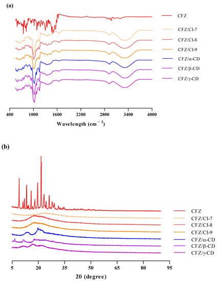 The Fourier transform infrared (FT-IR) spectra of the CFZ/CIs and CFZ/CDs complexes were acquired using a PerkinElmer Spectrum 400 spectrophotometer (Waltham, MA, USA). The sample spectra were recorded over the range of 400–4000 cm−1.