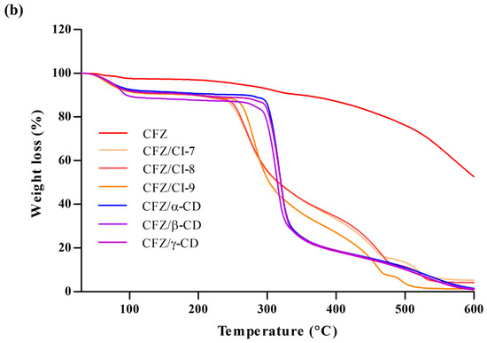 Thermal characterization of the CFZ, CFZ/CI complexes, and CFZ/CD complexes was performed using a thermogravimetric analyzer (TGA2, Mettler Toledo, GmbH, Greifensee, Switzerland) in a N2 atmosphere. The samples were heated from 20 °C to 600 °C at a rate of 10 °C per min.