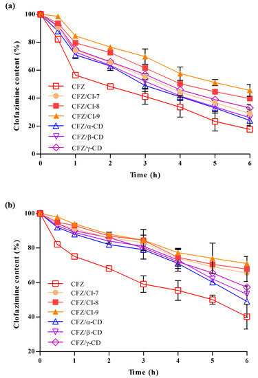We evaluated the stability of free CFZ, CFZ/CI complexes, and CFZ/CD complexes under the conditions of UV-induced degradation and FeCl3-induced oxidative degradation to assess the ability of CIs and CDs to protect the drug from environmental stresses. To this end, we measured the amounts of active CFZ in the CFZ/CI and CFZ/CD complexes over a 6 h exposure period (Figure 5a). As a control, we also included free CFZ, CFZ/CI complexes, and CFZ/CD complexes in the analysis. A significant degradation (>40%) of free CFZ was observed during the first hour of UV exposure, followed by consistent degradation of up to ~80% over a 6 h exposure. The stability of CFZ in CFZ/CI and CFZ/CD complexes under photodegradation conditions was slightly higher than that of free CFZ. However, CFZ/CD complexes also exhibited a severe degradation (approximately 70%) after 6 h of exposure. Conversely, the effect of UV irradiation on CFZ in CFZ/CI-9 was largely reduced, with less than 50% of CFZ degraded over the course of the 6 h exposure period.
