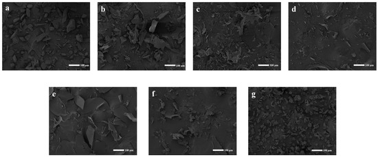 The morphological disparities between the individual constituents and the inclusion complex were highlighted through SEM images (Figure 6). Pure CFZ (Figure 6a) exhibited a standard state and a rectangular shape with angles. Conversely, significant changes in the morphology and shape of particles were observed in the CFZ/CI and CFZ/CD inclusion complexes (Figure 6b–g). Specifically, the original morphology of the two pure compounds was lost in the complex, while an amorphous powder with a slightly reduced size and no differentiation of the individual components were observed in all complex samples. These findings could potentially account for the observed rapid dissolution rate of the inclusion complex. The alterations in the innate morphology of the individual components suggested successful encapsulation between CFZ and CFZ/CIs and CDs, indicating the successful formation of an inclusion complex.