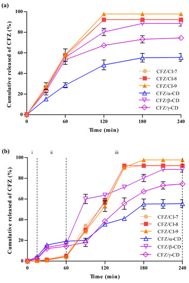 Encapsulation is a widely used technique to improve the bioavailability and therapeutic efficacy of drugs. In the present study, the release of encapsulated CFZ from CIs and CDs was investigated in a simulated gastrointestinal environment to evaluate the effect of CIs and CDs on drug release kinetics. First, the release of CFZ from CIs and CDs in simulated saliva fluid (SSF, pH 7.0) was determined (Figure 7b), and it was found that the release of CFZ was negligible in SSF due to the protective effect of the encapsulation agents. The protective effect of CIs and CDs against the highly acidic environment of the stomach was also evaluated in simulated gastric fluid (SGF, pH 2.0). The release of CFZ from the CIs in SGF was also negligible, indicating that CIs would provide an effective barrier to protect the encapsulated CFZ against the highly acidic stomach environment. On the other hand, the release characteristics of the CFZ/CD complexes in the simulated stomach increased with time, which was attributed to the decomposition of some CDs and the weakening of the bond between CFZ and CDs. This result suggested that the CDs might not be effective as a protective barrier against the highly acidic environment of the stomach. Subsequently, the CFZ/CI and CFZ/CD complexes were incubated with simulated intestinal fluid (SIF, pH 7.0) to observe the sustainable release of CFZ.