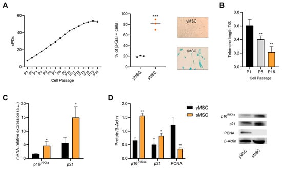 In vitro characterization of replicative senescent MSCs (sMSCs). (A) Characterization of sMSC by cumulative population doubling curve and (SA)-β-Gal activity. (B) Telomere length in bone marrow mesenchymal stromal cells, calculated according to 2−ΔΔCt method using a single-copy reference DNA for normalization. (C) p16ink4a and p21 mRNA expression. Data are reported as relative expression according to 2−ΔΔCt method using IPO8 as housekeeping. (D) Representative Western blot analysis of p16ink4a, p21 and PCNA protein expression and densitometric analysis using β-Actin as loading control. The results are expressed as mean ±SD from three independent biological replicates. Paired t test, * p < 0.05, ** p < 0.01, *** p < 0.001 vs. yMSC.
