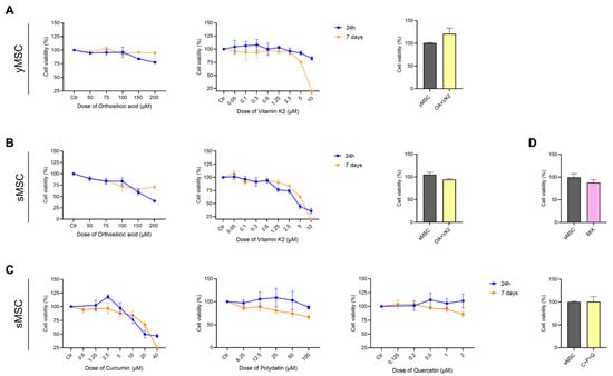 The cytotoxic effect of orthosilicic acid (OA), vitamin K2 (VK2), curcumin (CUR), polydatin (PD) and quercetin (QCT), alone and in the combination of OA and VK2 (OA+VK2), CUR, PD and QCT (C+P+Q) and the five compounds (MIX) was evaluated. Cell viability of yMSC and sMSC was analyzed after 24 h and 7 days of treatment by MTT assay (Figure 2). Further experiments were performed considering the concentration of compounds that gave at least >70% viability of treated cells (75 μM OA; 0.1 μM VK2; 1 μM CUR; 10 μM PD and 0.5 μM QCT).