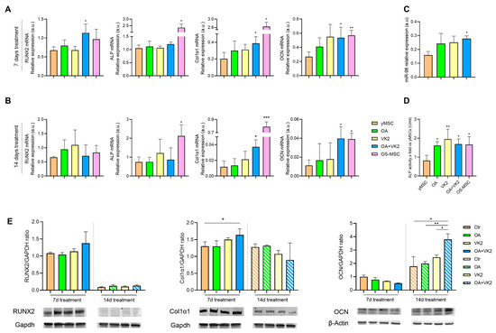 To test the possible pro-osteogenic efficacy of OA and VK2 on yMSC, we first characterised bone marrow mesenchymal stromal cells’ ability to differentiate into osteoblasts in vitro, by analysing the main osteogenic markers such as transcription factor Runt-related transcription factor 2 (RUNX2), alkaline phosphatase (ALP), collagen type 1 alpha 1 (COL1α1) and osteocalcin (OCN) using Alizarin Red staining [38] (Supplementary Figure S1). yMSC were treated with OA, VK2 and their combination for 7 and 14 days without other pro-osteogenic factors (Figure 3). We observed that individual compounds were not effective at modulating the mRNA of differentiation markers, either after 7 or 14 days (Figure 3A,B), whereas their association (OA+VK2) successfully increased RUNX2, COL1α1 and OCN mRNA expression (Figure 3A), with a synergistic effect for RUNX2 and ALP after 7 days, and COL1α1 and OCN after 14 days (Figure 3B) (Table 1). Although ALP mRNA expression was not modulated either after 7 or 14 days, OA, VK2 and their association successfully increased its activity, which was tested after 7 days of treatment (Figure 3D). As one of the osteogenic promoters’ miRNAs, miR-98 expression was also evaluated [39,40]. Again, OA and VK2 alone slightly increased miR-98 expression, which was significantly up-regulated by their combination (Figure 3C). Protein expression analysis by Western blotting confirmed a significant up-regulation of Col1α1 after 7 days, and of OCN after 14 days of treatment with OA+VK2 (Figure 3E).