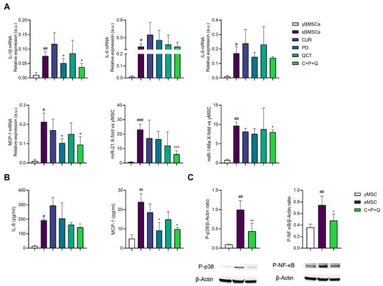 Curcumin, polydatin and quercetin exert an anti-inflammatory effect on sMSC. (A) IL-1β, IL-6, IL-8, MCP-1 mRNA and miR-21 and miR-146a expression of sMSC treated with CUR, PD and QCT for 24h. Data are reported as relative expression according to 2−ΔΔCt method, using IPO8 and RNU44 as housekeeping. (B) Concentration (pg/mL) of IL-8 and MCP-1 in the conditioned medium of untreated and treated sMSC. Histograms represent the mean of three independent experiments ± SD. (C) Representative Western blot analysis showing P-p38 and P-NF-κB protein expression, using β-actin as loading control. The bands were quantified by ImageJ. The results are expressed as mean ± SD from three independent biological replicates. Paired t test, # p < 0.05, ## p < 0.01, ### p < 0.001 vs. untreated yMSC, * p < 0.05, ** p < 0.01, *** p <0.001 vs. untreated sMSC.