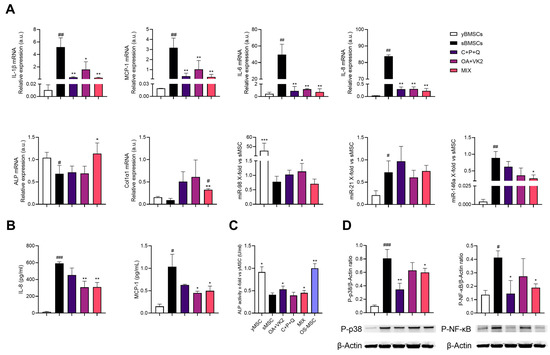 Anti-inflammatory and pro-osteogenic effect of OA+VK2, C+P+Q and their combination (MIX) in sMSC. (A) IL-1β, MCP-1, IL-6, IL-8, ALP, COL1α1 mRNA and miR-98, miR-21, miR-146a expression in sMSC treated with OA+VK2, C+P+Q and MIX for 7 days and yMSC (not differentiated). Data are reported as relative expression according to 2−ΔΔCt and using IPO8 and RNU44 as housekeeping. (B) Concentration (pg/mL) of IL-8 and MCP-1 in conditioned media of yMSC, untreated and treated sMSC. (C) ALP activity in sMSC treated for 7 days with OA+VK2, C+P+Q and MIX. (D) Representative Western blot analysis of P-p38 and P-NF-κB protein expression with β-actin as loading control. The bands were quantified by ImageJ. The results are expressed as mean ± SD from three independent biological replicates. Paired t test, # p < 0.05, ## p < 0.01, ### p < 0.001 vs. untreated yMSC, * p < 0.05, ** p < 0.01, *** p < 0.001 vs. untreated sMSC.