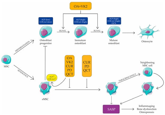 Schematic representation of orthosilicic acid (OA), vitamin K2 (VK2), curcumin (CUR), polydatin (PD) and quercetin (QCT) effects on MSC and sMSC. OA and VK2 combination up-regulated RUNX2, ALP and COL1α1 (upper part of the figure). CUR, PD and QCT combination inhibited SASP, which plays a role in low bone degeneration in aging. The association of the five compounds (OA, VK2, CUR, PD and QCT) and increased ALP and COL1α1 expression and inhibited SASP in sMSC. Overall, it can be suggested that reducing inflammation and promoting MSC (both young and senescent) differentiation by using these natural compounds might be a valid strategy to prevent bone loss during aging. This figure was created using the Servier Medical Art Commons Attribution 3.0 Unported Licence (http://smart.servier.com (accessed on 21 April 2023)).