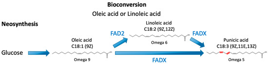 Punicic acid biosynthesis. Punicic acid (PuA) can be synthesized via neosynthesis from phosphatidylcholine and a carbon source such as glucose or via bioconversion using oleic acid or linoleic acid. The oleic moiety can undergo desaturation by a Δ12-desaturase (FAD2) giving rise to linoleic acid, which undergoes another desaturation and isomerization by a specific bifunctional fatty acid conjugase/desaturase (FADX), giving rise to PuA. The enzyme FADX can also directly transform oleic acid into PuA. Note that the process of bioconversion takes place on acyl moiety esterified to molecule of phosphatidylcholine. The introduced double bonds are highlighted in red.