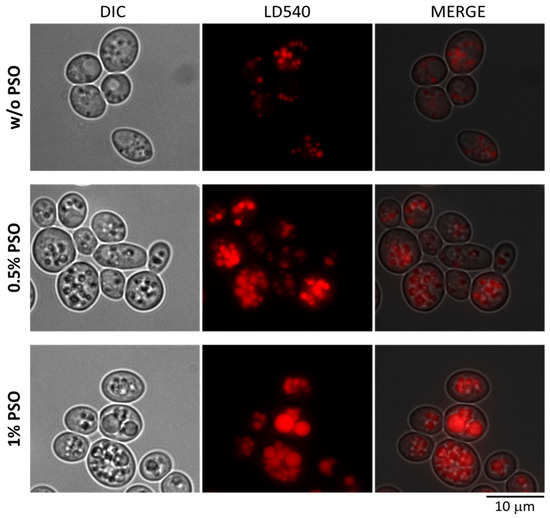 Microscopy of strain JMY3820 grown on YPD supplemented with PSO of indicated concentrations for 72 h. The red color represents the staining of lipid bodies visualized by LD540 a lipid body-specific dye. Images were obtained using a Leica DM5500 fluorescence microscope (Leica Microsystems, Wetzlar, Germany) with a 100× HCXFL OIL objective and filter system Y3 for CY3 green and Leica DFC340 FX Digital Cam for fluorescence microscopy. LAS X Leica software platform (Version 3.0) was used for image acquisition.