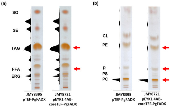 Lipid profile of recombinant Y. lipolytica strains grown on YPD medium containing 6% (w/v) glucose: (a) TLC of neutral lipids, showing densitogram (276 nm) and visualization; (b) TLC of polar lipids, showing densitogram (276 nm) and visualization. JMY8395 (URA3ex-pTEF-PgFADX) and JMY8721 (Δeyk1 + URA3ex-pEYK1 4AB-coreTEF-PgFADX). The red arrow indicates the presence of PuA. Abbreviations: SQ (squalene), SE (steryl ester), TAG (triacylglycerol), FFA (free fatty acid), ERG (ergosterol), CL (cardiolipin), PE (phosphatidylethanolamine), PI (phosphatidylinositol), PS (phosphatidylserine), and PC (phosphatidylcholine).