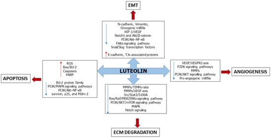 Luteolin is one of the most widespread food-derived flavonoids showing preventive and therapeutic effects against several cancer types [,,]. The main purpose of this review is to summarize the most relevant knowledge about the antimetastatic properties of luteolin, emphasizing its interference with key events underlying tumor progression and expansion, namely (i) epithelial-to-mesenchymal transition (EMT), (ii) angiogenesis, (iii) degradation of the extracellular matrix (ECM) and iv) induction of apoptosis (Figure 1). In detail, we report and discuss the most relevant findings from in vitro and in vivo studies (including animal models) that describe the effects of luteolin at both the cellular and molecular level, focusing on major signaling pathways involved in tumor metastasis (Table 1).