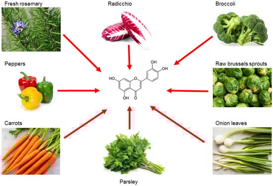Luteolin is a flavonoid belonging to the flavone family; it is isolated from several vegetables and edible herbs, including radicchio, broccoli, raw brussels sprouts, onion leaves, parsley, carrots, peppers and rosemary, where it can occur either as aglycone or bound to one or several carbohydrates as glycoside [] (Figure 2).